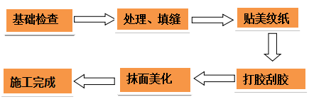 在完成基礎(chǔ)板材鋪貼(干掛)后,進(jìn)行墻面檢查是否有污物,填縫,貼美紋紙,打膠,刮膠,撕美紋紙和抹面美化,完工。具體工藝和工序如右圖: